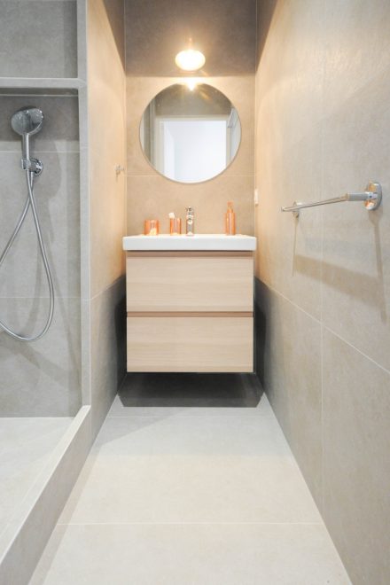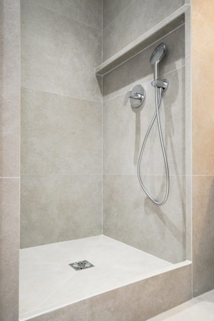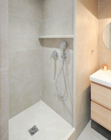 Création d’une tablette maçonnée et carrelée sur-mesure. Pose en pointe de diamant pour le sol de douche à l’italienne.