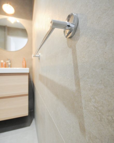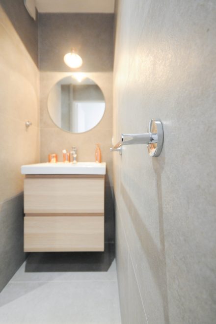 Sobriété et élégance pour cette salle d’eau carrelée du sol au plafond.